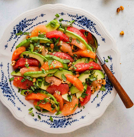 4. رتبوا السبانخ والأفوكادو والبرتقال والجريب فروت والبصل الأخضر في طبق.