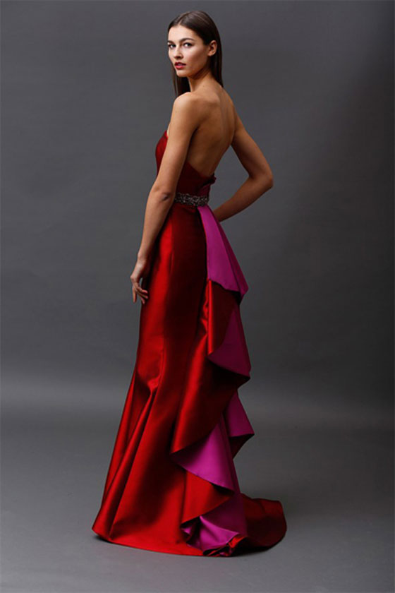 فستان بموديل أنثوي راقي، والتموجات تزين الظهر بمزيج من الأحمر والفوشيا