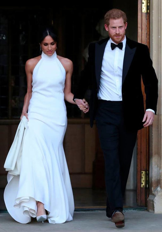 ثوب الحفل المسائي: غادر دوق ودوقة ساسيكس حفل الاستقبال بعد الزفاف للاستعداد للحفل المسائي، حيث ارتدت ميغان فستانا من تصميم، ستيلا ماكارتني، التي قالت: "شعرت أن الفستان يمثلها، كان نفحة من روحها، أنا أحب ذلك". وبعد الزفاف، عرضت ماكارتني نسخة مطابقة للفستان للبيع، مقابل 3500 جنيه إسترليني.