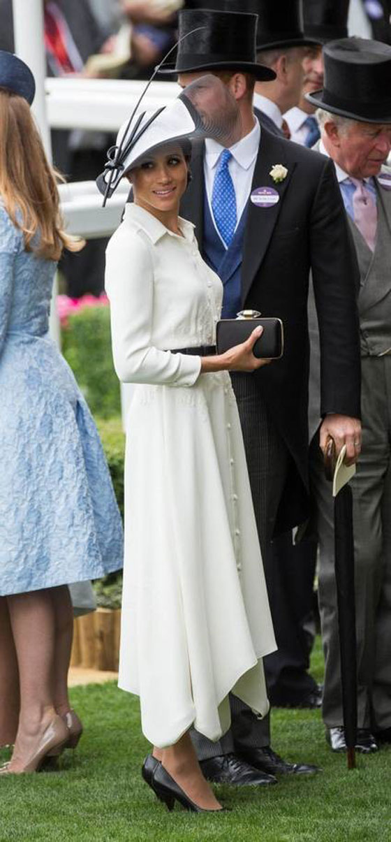 الرحلة الأولى إلى أسكوت: زار الأمير هاري وزوجته رويال أسكوت للمرة الأولى، يوم الثلاثاء 21 يونيو الجاري. واختارت، ماركل، جيفينشي مرة أخرى مرتدية قميصا أبيض على هيئة فستان.