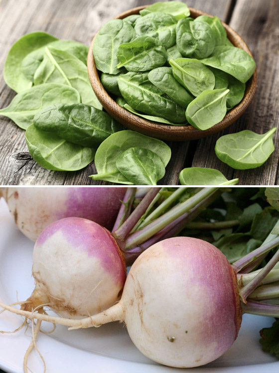 1. السبانخ واللفت: هل سبق لك أن رأيت ما يحدث للسبانخ أو اللفت عندما يتم طهيهما؟ إنهما ينكمشان كليا. فهما مليئان بحمض الفوليك والكالسيوم والحديد والمغنيسيوم والمواد المضادة للأكسدة. والسبانخ يصبح أكثر سلاسة خاصة عند قليه مع زيت جوز الهند، وإضافة قليل من الملح والفلفل الأسود المطحون الطازج إليه. وللسبانخ دور كبير في خفض مستويات الكوليسترول.