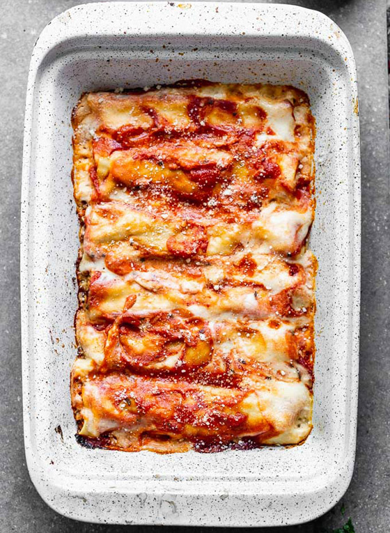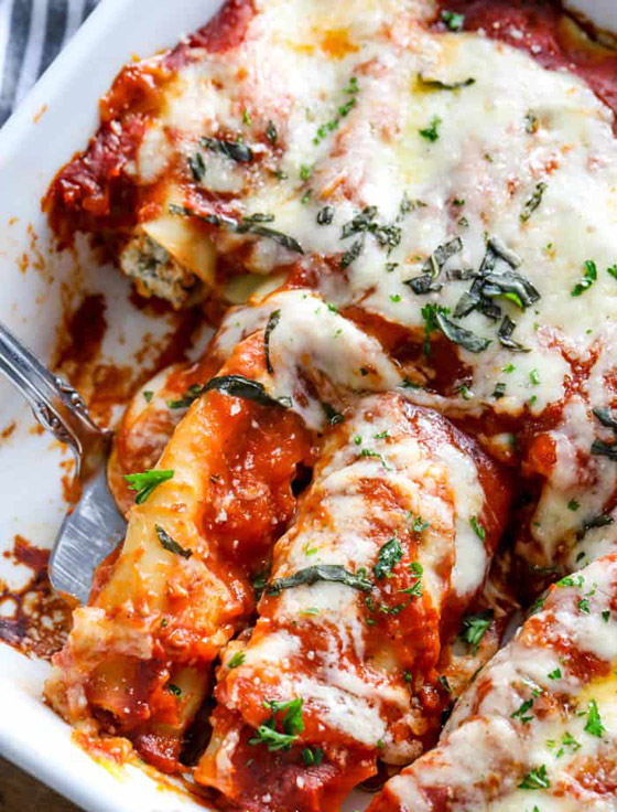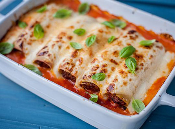 6. صفوا لفائف الكانيلوني في صينية بايركس مدهونة بسمن أو زيت.