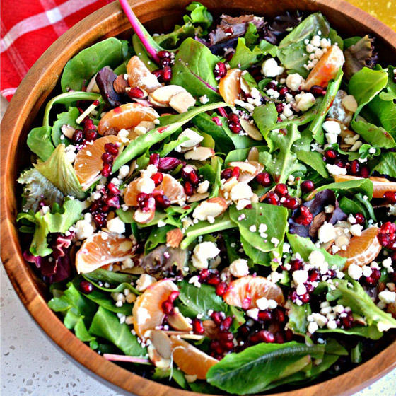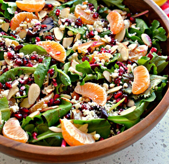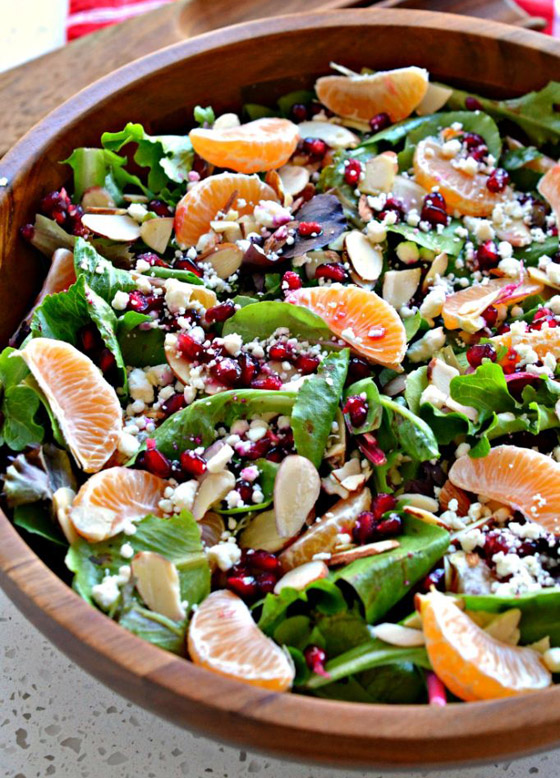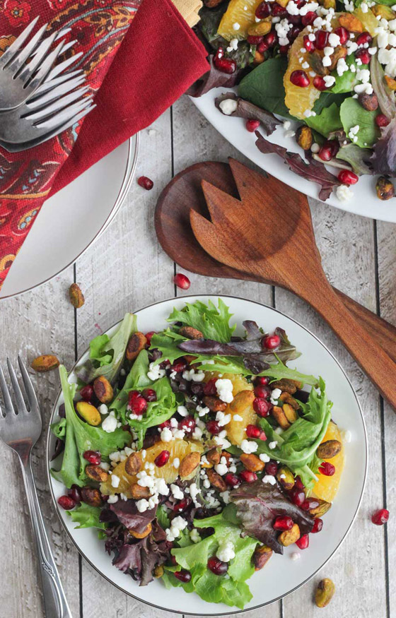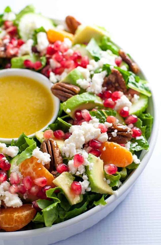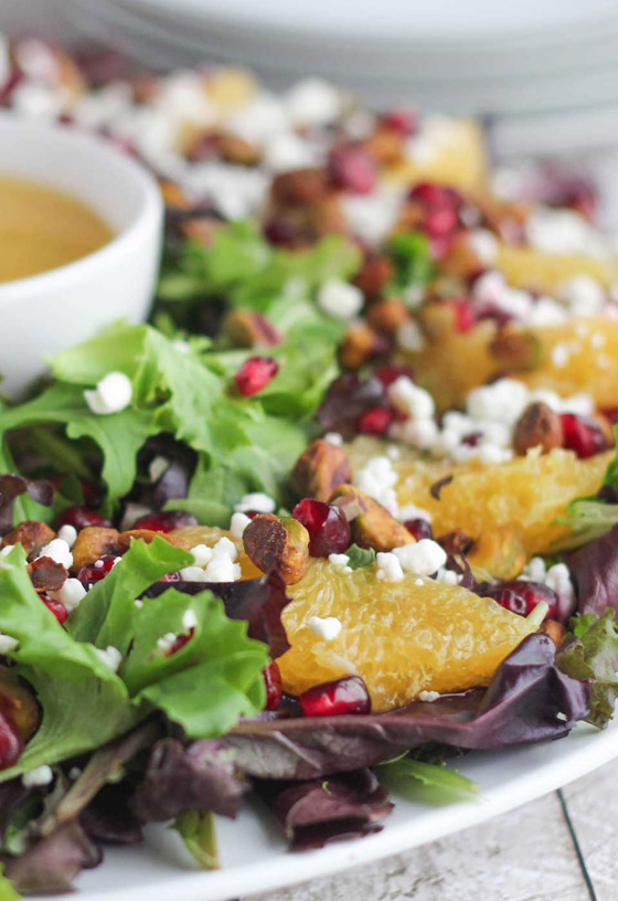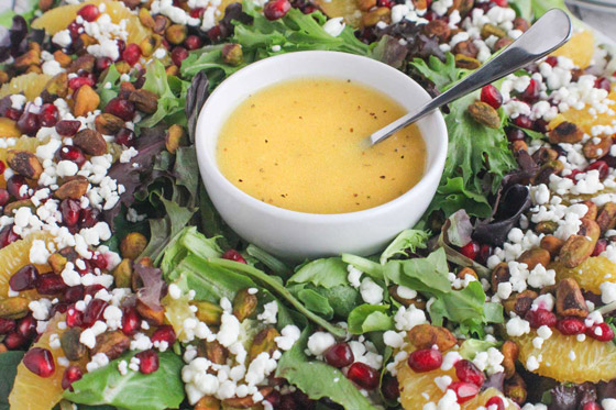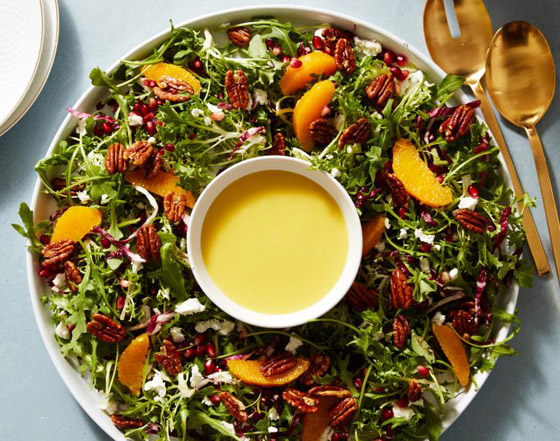5. للتقديم، انثروا البقان بالعسل وشرائح البرتقال وبذور الرمان وجبنة الفيتا فوق إكليل الخس.