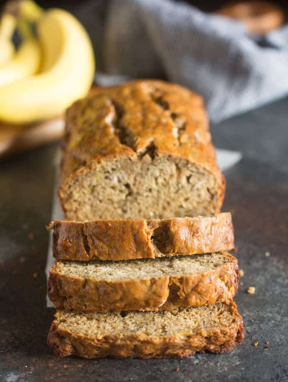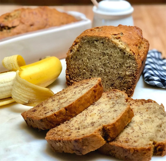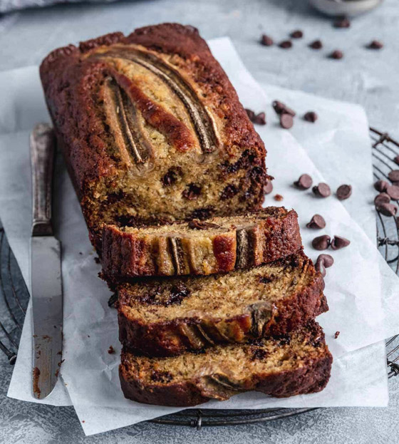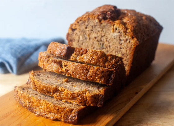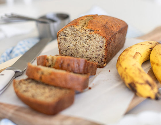 تُعد وصفة خبز الموز طريقة رائعة لاستغلال الفاكهة الناضجة، كما تجعل تناول الإفطار في الصباح المزدحم أسهل قليلاً إذ يمكن تحضيره مسبقاً. يتماشى خبز الإفطار هذا مع ملعقة صغيرة من الجبن القريش وقليل من التوت.