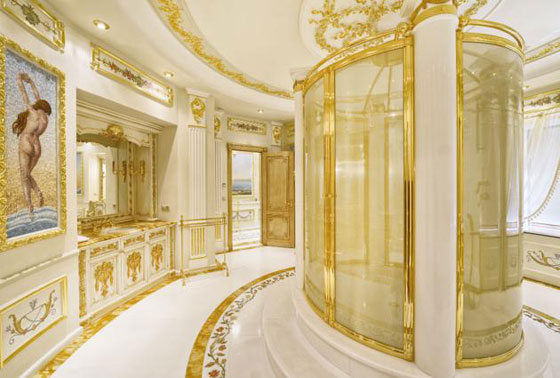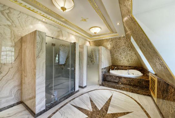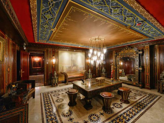 ويمكن وصفه بأنه قصر ذهبي، ويرجع ذلك إلى اللون الذهبي الذي طليت به الجدران والأدوات المنزلية للقصر. ويشبه المنظر الخارجي للقصر القلاع الريفية الأوروبية، في ما تحاكي زخارفه النمط المعماري للقرن الـ 18، ويوجد به قاعة للتدليك ومنطقة "سبا" ومسبحان.