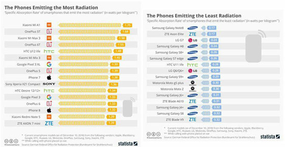 وتصدرت هواتف شركتي "شاومي" و"وان بلس" الصينتين الرائدتين قائمة الهواتف الذكية الأكثر إصدارا للإشعاع. وحذرت الإحصائية من أن الهواتف الأكثر إصدارا للإشعاعات ينبغي أن تكون بعيدة لفترة كافية عن المستخدم، حتى لا يتعاظم تأثيرها عليهم، وخاصة الأطفال. ووضعت القائمة شركة "ستاتيستا" بالتعاون مع المكتب الاتحاد الألماني. ونشرها موقع "ديجتال تريندز" التقني المتخصص بالهواتف.