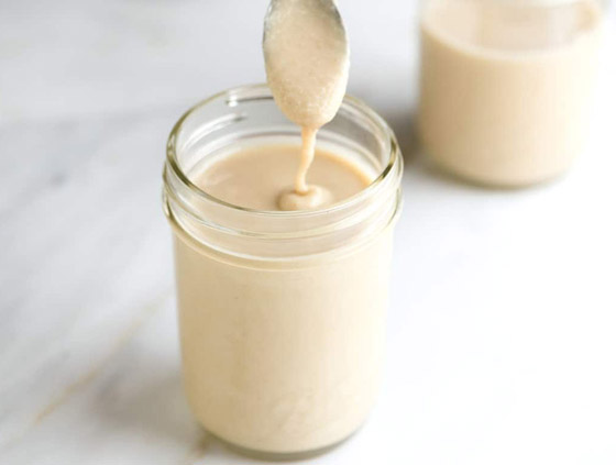 8. الطحينة: يقدم معجون السمسم المطحون اللذيذ إضافة رائعة للأطعمة الحلوة والمالحة على حد سواء. إنه أيضاً بديل رائع لزبدة الجوز لمن يعانون من الحساسية. تضاف الطحينة نكهة مالحة ولذيذة إلى العصائر، كما أنها غنية بالدهون الصحية الأحادية غير المشبعة التي تجعلك لا تشعر بالجوع لفترة طويلة.